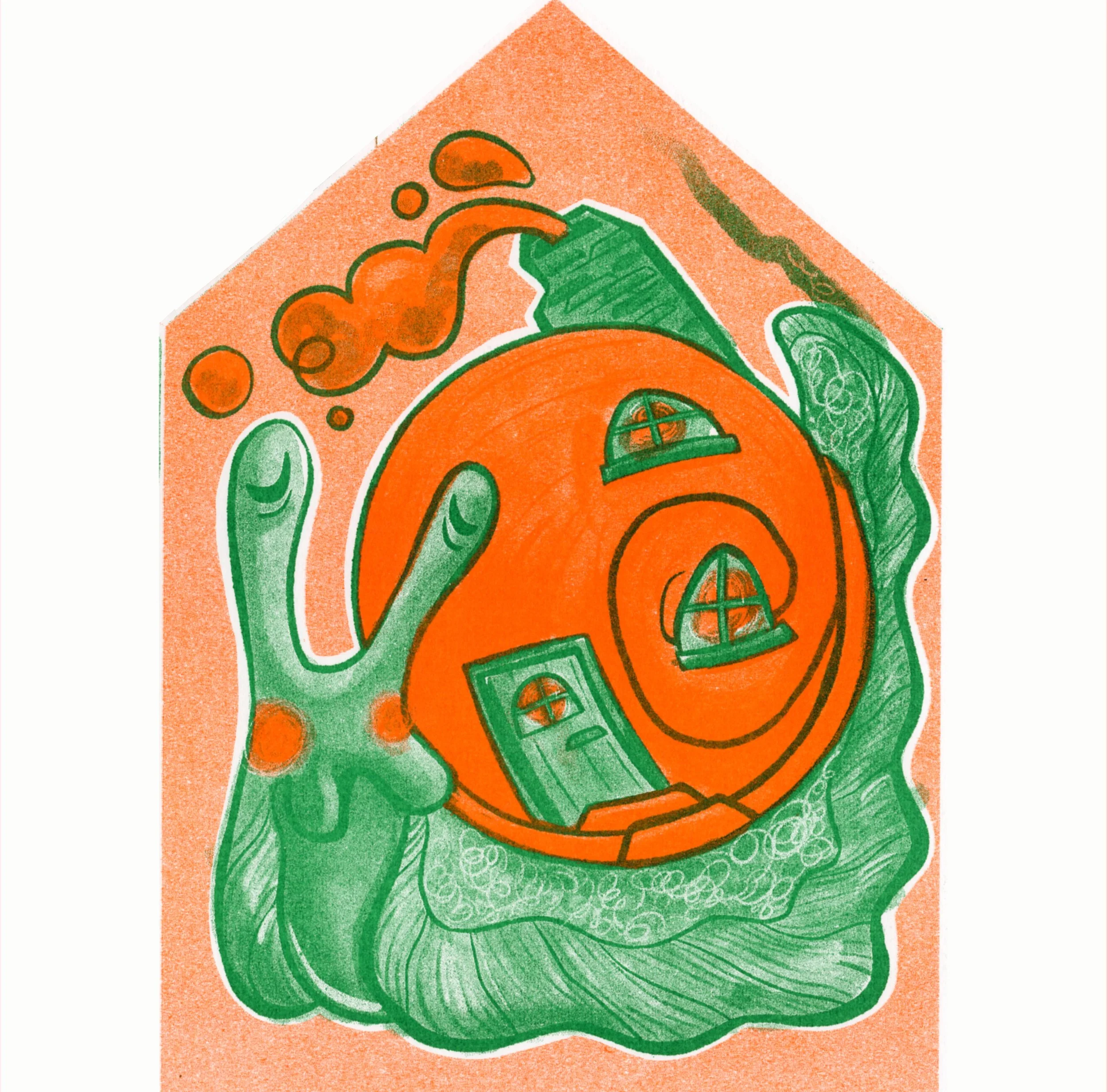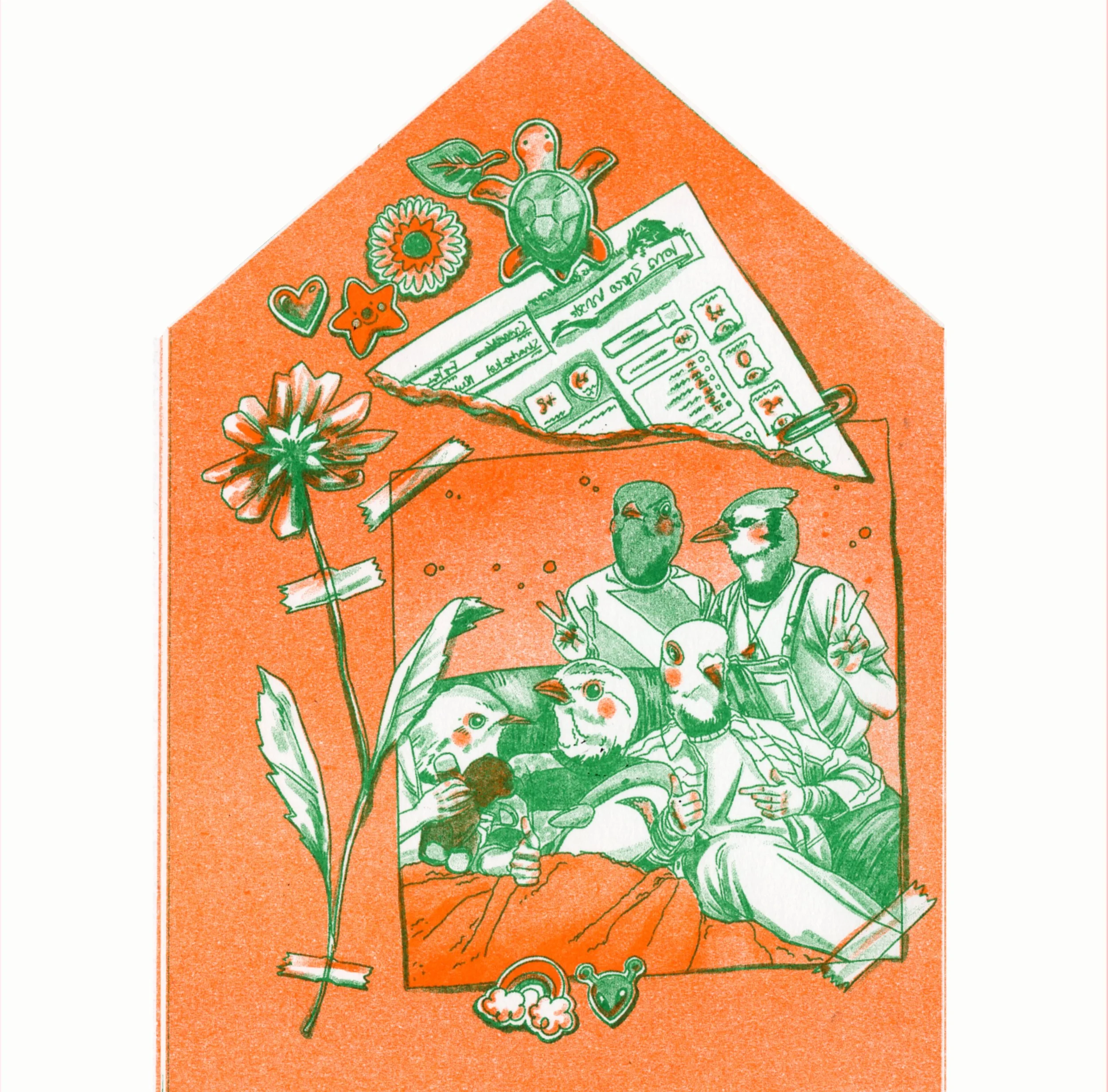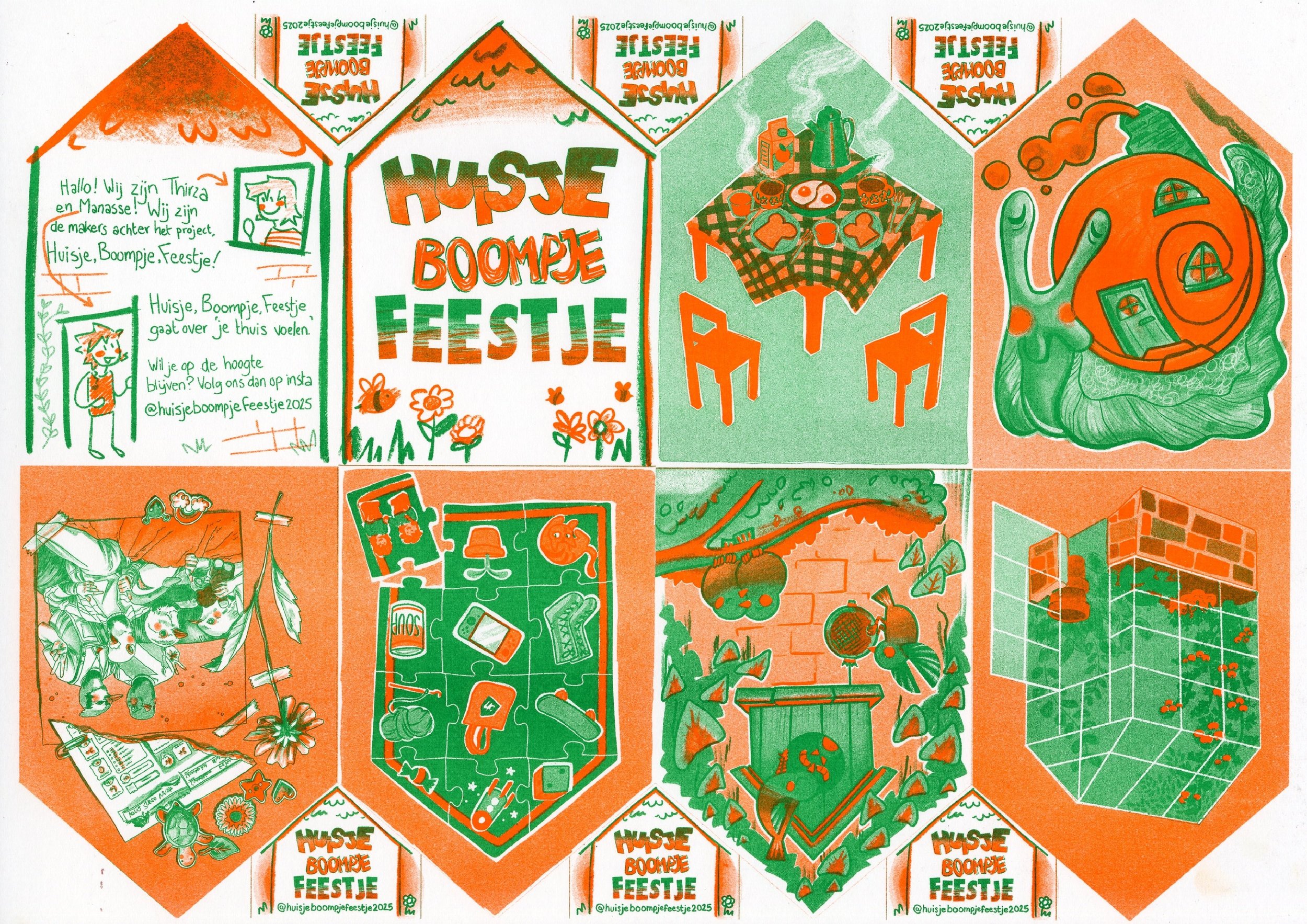 First I made a drawing with ink, watercolor and pencil. I scanned that, put it together digitally and printed it as a A2 poster with a fluor pink a black layer using the A2 risoprinter in Gent. In Breda I used the letterpress to press words on the backside of the poster. I folded the poster to an A4 and made a binder using riso.